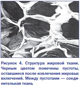 Предпочтительнее — в подкожной клетчатке, сальнике, брыжейке, забрюшном пространстве и костном мозгу (желтый костный мозг). Между скоплениями жировых клеток располагаются капилляры, нервные волокна, активные клеточные элементы (включая лимфатические клетки, гистиоциты и др.). Кроме того, жировая ткань служит резервным депо (или камерой хранения) энергии, она является отличным теплоизолятором и предохраняет структуры организма от механических повреждений (рис. 3, 4).