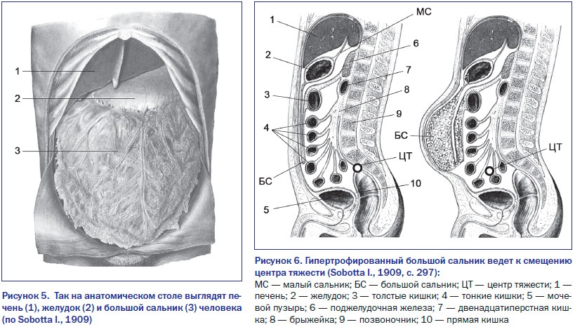 Большой и малый сальники прикрывают кишечник спереди подобно фартуку (рис. 5). Длина этого фартука может колебаться от 10 до 70 см. Колеблется и форма — полукруглая, квадратная. Живот не защищен спереди решеткой из бедер, потому предохранительный слой жира в чем-то полезен. Тем более, что такая броня параллельно решает и другие биологические задачи. Большой сальник пронизан кровеносными сосудами, а малый — еще и множеством нервных структур.