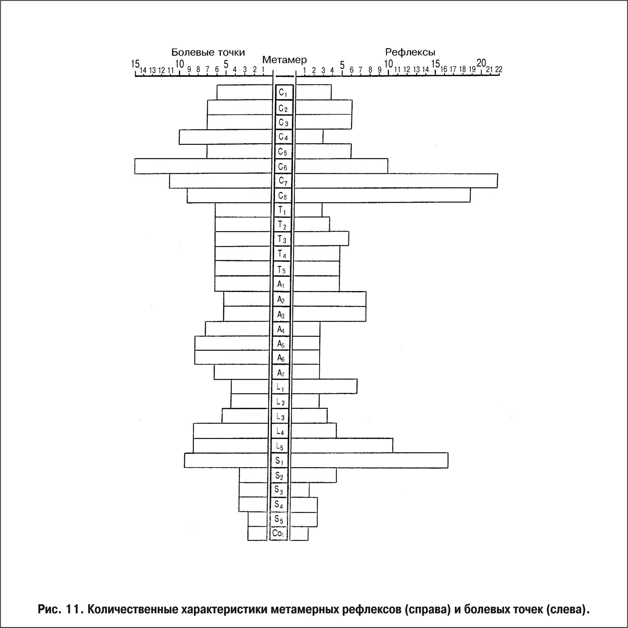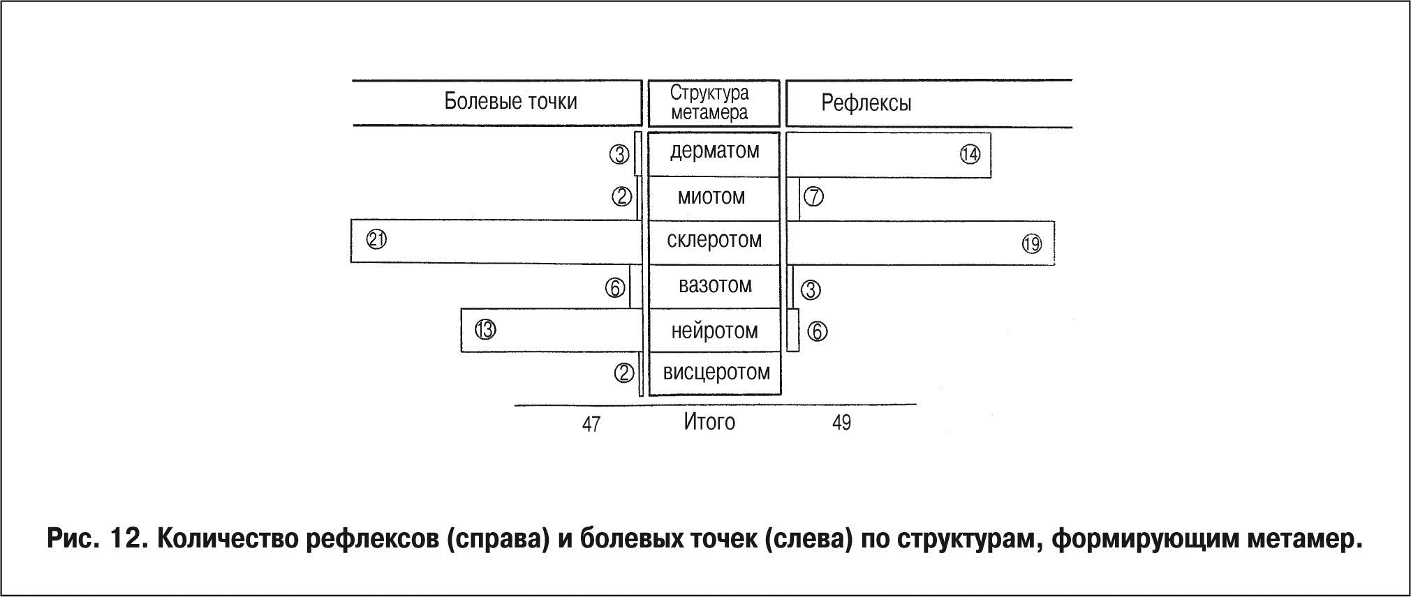 Рис. 11. Количественные характеристики метамерных рефлексов (справа) и болевых точек (слева).