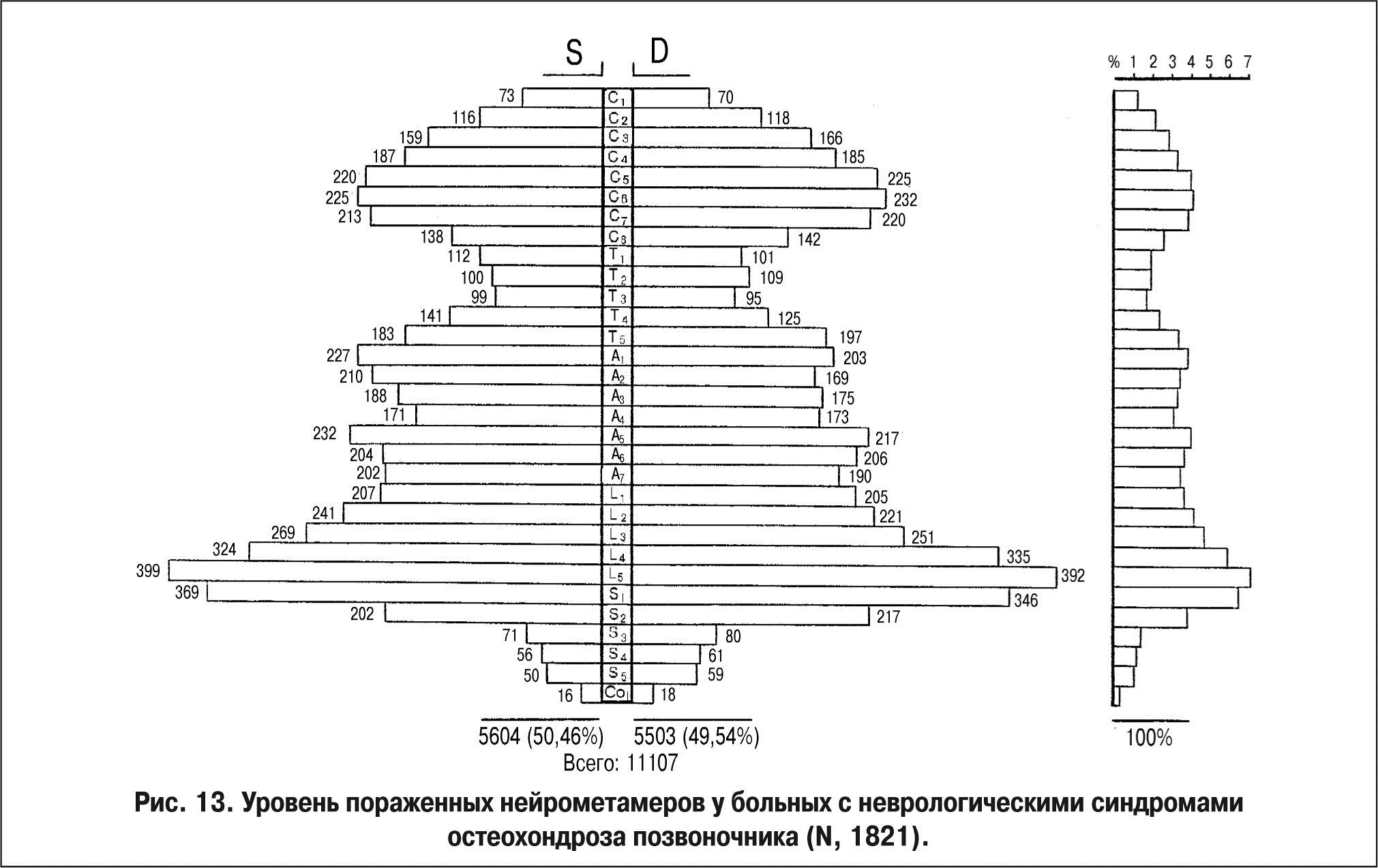 Рис. 13. Уровень пораженных нейрометамеров у больных с неврологическими синдромами остеохондроза позвоночника (N, 1821).