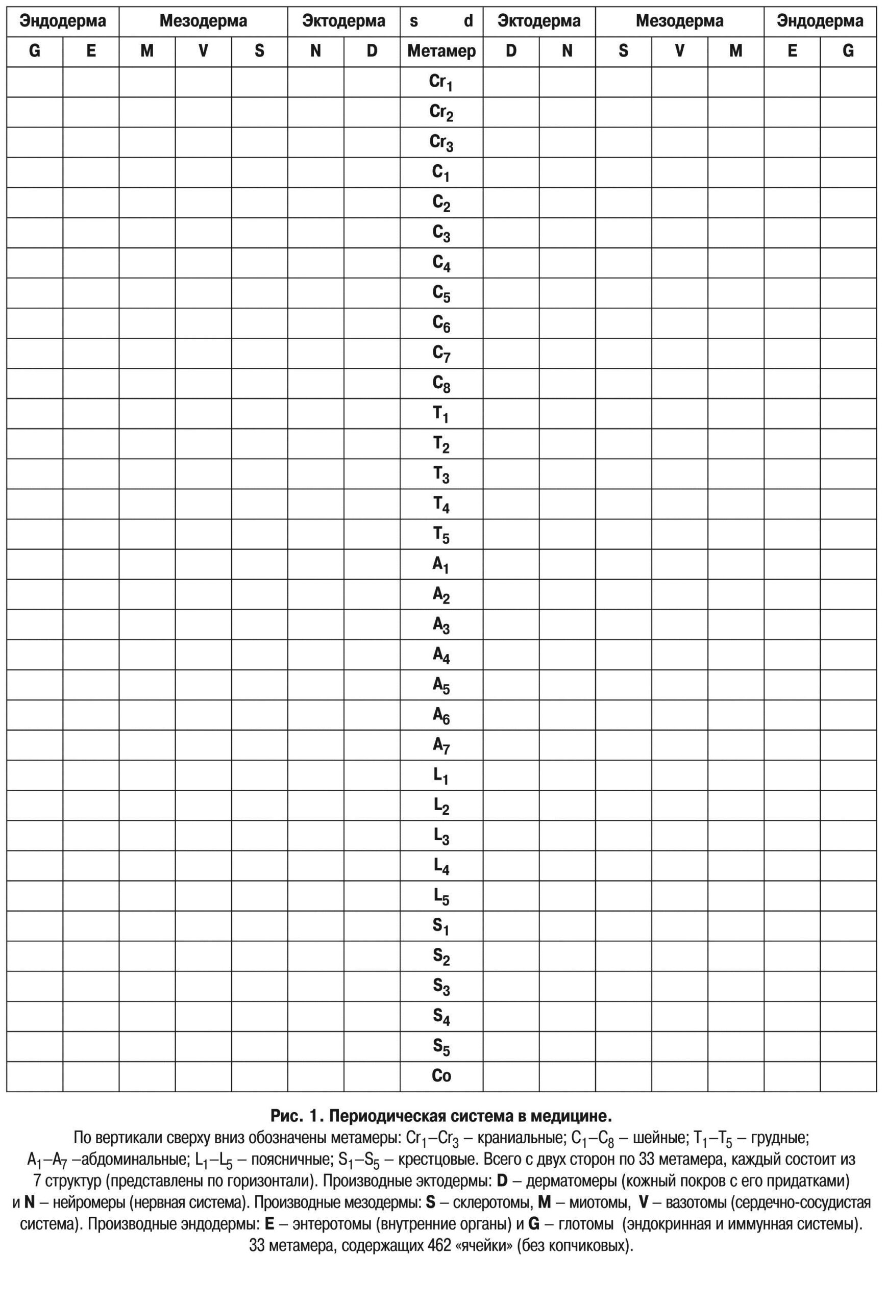 По вертикали сверху вниз обозначены метамеры: Cr1–Cr3 – краниальные; С1–С8 – шейные; Т1–Т5 – грудные; А1–А7 –абдоминальные; L1–L5 – поясничные; S1–S5 – крестцовые. Всего с двух сторон по 33 метамера, каждый состоит из 7 структур (представлены по горизонтали). Производные эктодермы: D – дерматомеры (кожный покров с его придатками) и N – нейромеры (нервная система). Производные мезодермы: S – склеротомы, М – миотомы, V – вазотомы (сердечно-сосудистая система). Производные эндодермы: Е – энтеротомы (внутренние органы) и G – глотомы (эндокринная и иммунная системы). 33 метамера, содержащих 462 «ячейки» (без копчиковых).