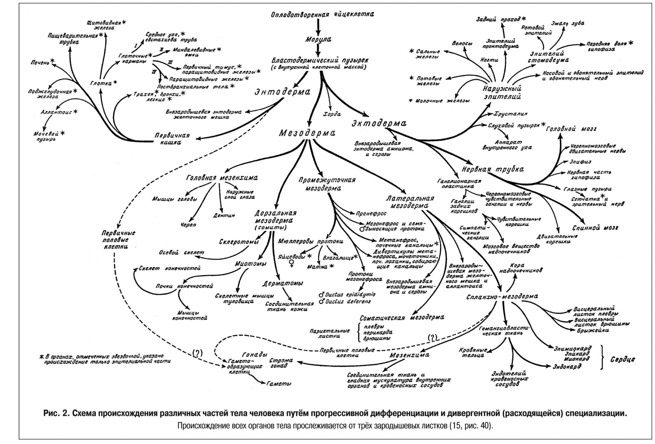 Рис. 2. Схема происхождения различных частей тела человека путём прогрессивной дифференциации и дивергентной (расходящейся) специализации.