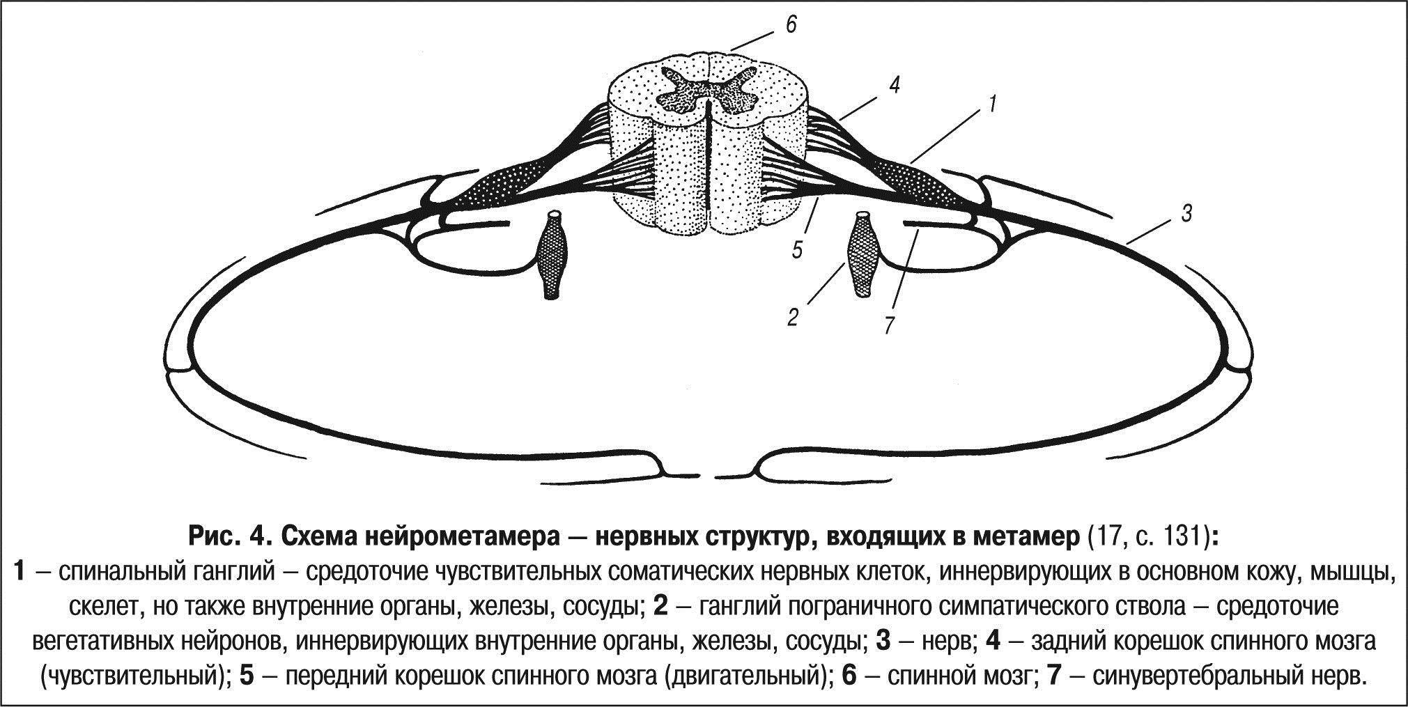 1 — спинальный ганглий — средоточие чувствительных соматических нервных клеток, иннервирующих в основном кожу, мышцы, скелет, но также внутренние органы, железы, сосуды; 2 — ганглий пограничного симпатического ствола — средоточие вегетативных нейронов, иннервирующих внутренние органы, железы, сосуды; 3 — нерв; 4 — задний корешок спинного мезга (чувствительный); 5 — передний корешок спинного мозга (двигательный); 6 — спинной мозг; 7 — синувертебральный нерв.