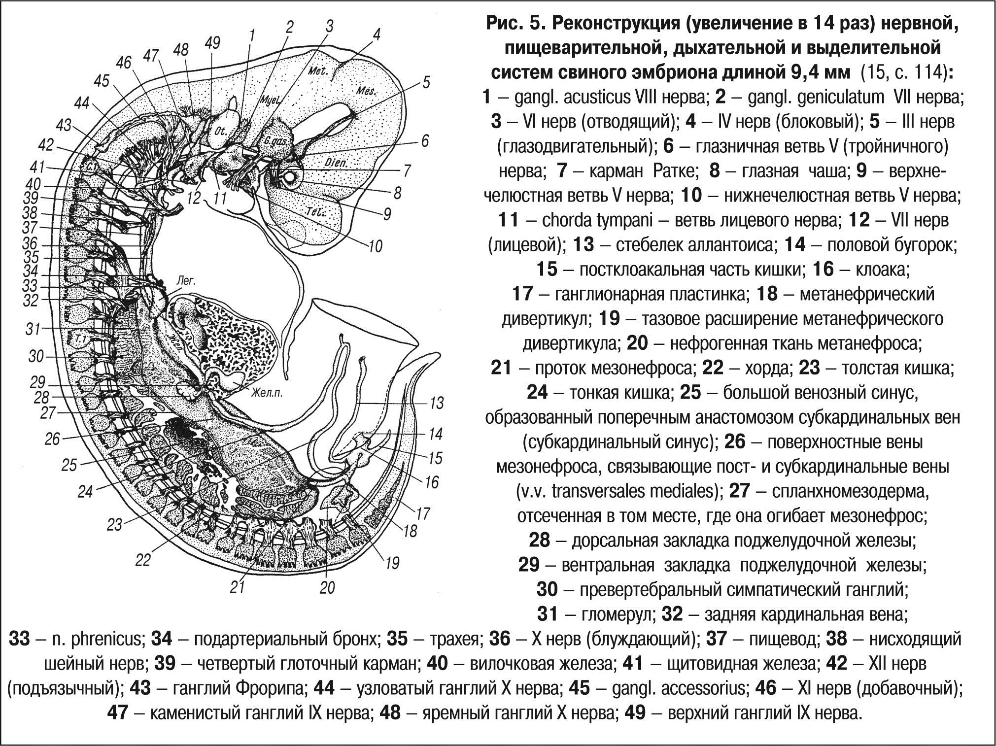 1 — gangl. acusticus VIII нерва; 2 — gangl. geniculatum VII нерва; 3 — VI нерв (отводящий); 4 — IV нерв (блоковый); 5 — III нерв (глазодвигательный); 6 — глазничная ветвь V (тройничного) нерва; 7 — карман Ратке; 8 — глазная чаша; 9 — верхне-челюстная ветвь V нерва; 10 — нижнечелюстная ветвь V нерва; 11 — chorda tympani — ветвь лицевого нерва; 12 — VII нерв (лицевой); 13 — стебелек аллантоиса; 14 — половой бугорок; 15 — постклоакальная часть кишки; 16 — клоака; 17 — ганглионарная пластинка; 18 — метанефрический дивертикул; 19 — тазовое расширение метанефрического дивертикула; 20 — нефрогенная ткань метанефроса; 21 — проток мезонефроса; 22 — хорда; 23 — толстая кишка; 24 — тонкая кишка; 25 — большой венозный синус, образованный поперечным анастомозом субкардинальных вен (субкардинальный синус); 26 — поверхностные вены мезонефроса, связывающие пост- и субкардинальные вены (v.v. transversales mediales); 27 — спланхномезодерма, отсеченная в том месте, где она огибает мезонефрос; 28 — дорcальная закладка поджелудочной железы; 29 — вентральная закладка поджелудочной железы; 30 — превертебральный симпатический ганглий; 31 — гломерул; 32 — задняя кардинальная вена; 33 — n. phrenicus; 34 — подартериальный бронх; 35 — трахея; 36 — X нерв (блуждающий); 37 — пищевод; 38 — нисходящий шейный нерв; 39 — четвертый глоточный карман; 40 — вилочковая железа; 41 — щитовидная железа; 42 — XII нерв (подъязычный); 43 — ганглий Фрорипа; 44 — узловатый ганглий X нерва; 45 — gangl. accessorius; 46 — XI нерв (добавочный); 47 — каменистый ганглий IX нерва; 48 — яремный ганглий X нерва; 49 — верхний ганглий IX нерва.
