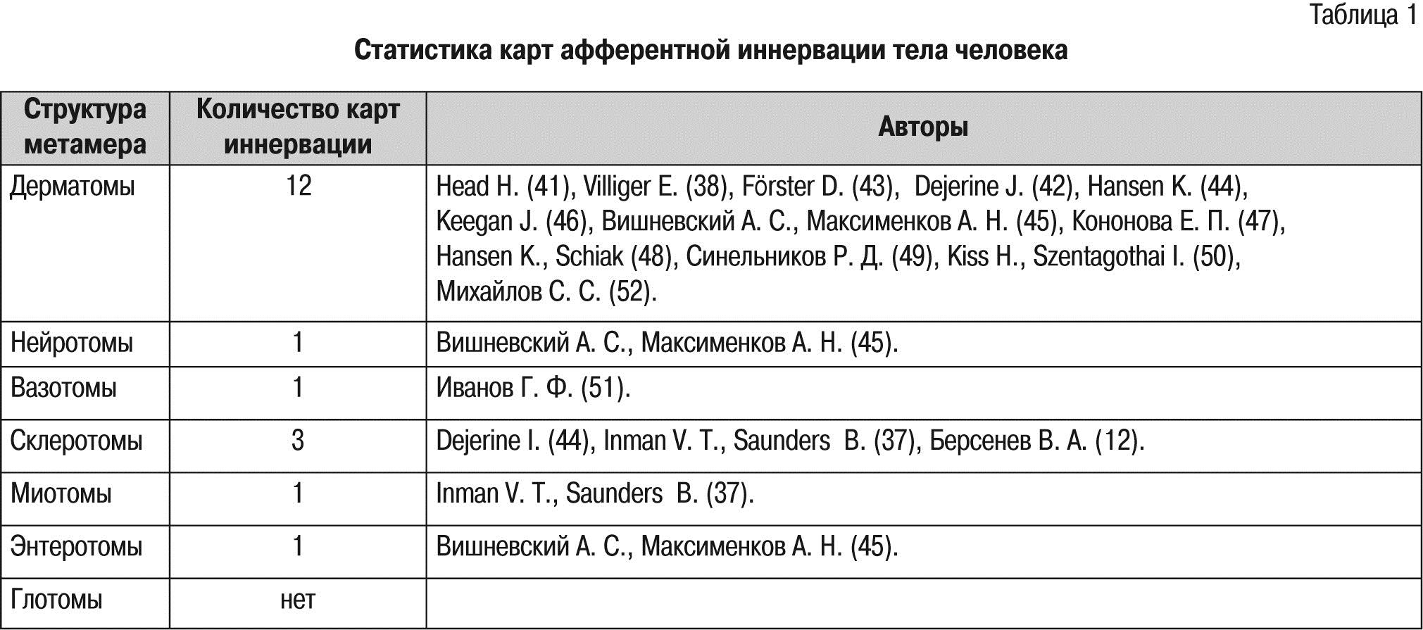 Статистика карт афферентной иннервации (табл. 1) показывает, насколько слабо ещё изучены болезни человека и сама боль, часто сопровождающая наши недуги.