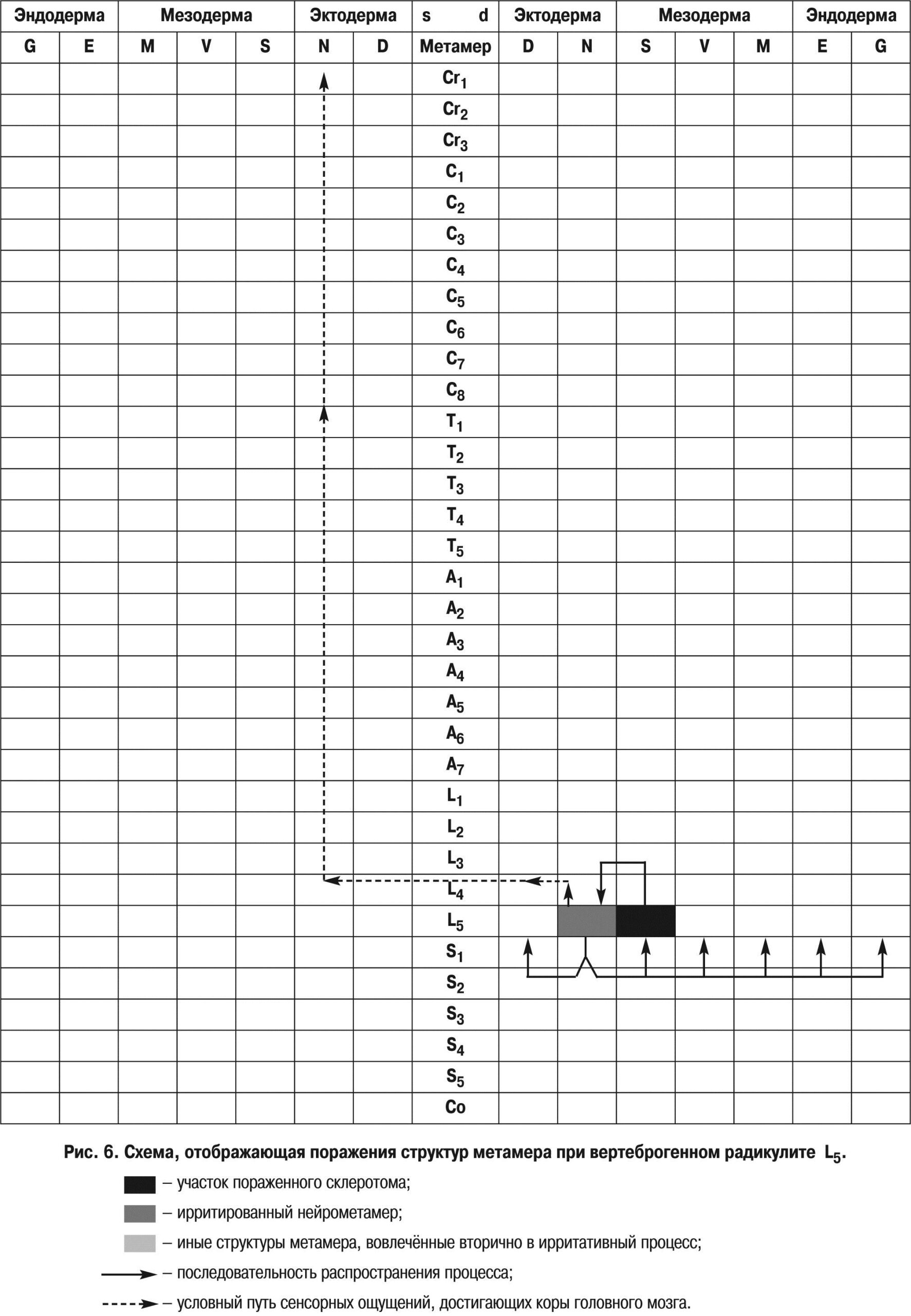 Рис. 6. Схема, отображающая поражения структур метамера при вертеброгенном радикулите L5.