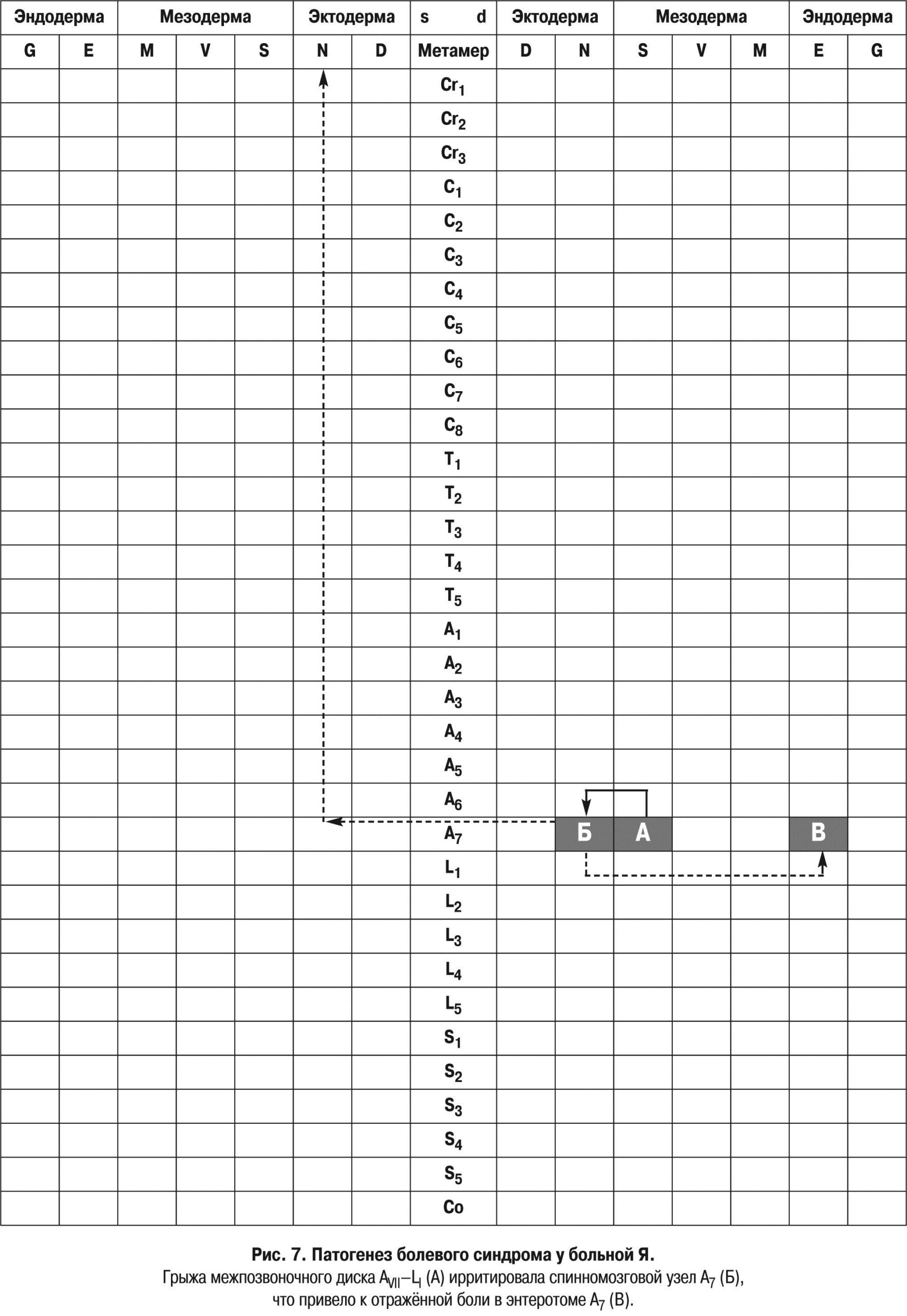 Из формулы вытекает, что дегенеративный процесс (D) привёл к протрузии (грыже) межпозвоночного диска АVII–LI, а это вызвало ирритацию нейрометамера А7. Вследствие чего развивались боли в нижней зоне живота (А7 E). И это означает, что боль возникла в здоровых тканях седьмого абдоминального энтеротома. Сведённые к формуле диагностические данные позволяют сделать вывод, что целью лечебного процесса должна стать ликвидация конфликта между склеротомом и нейротомом в А7.