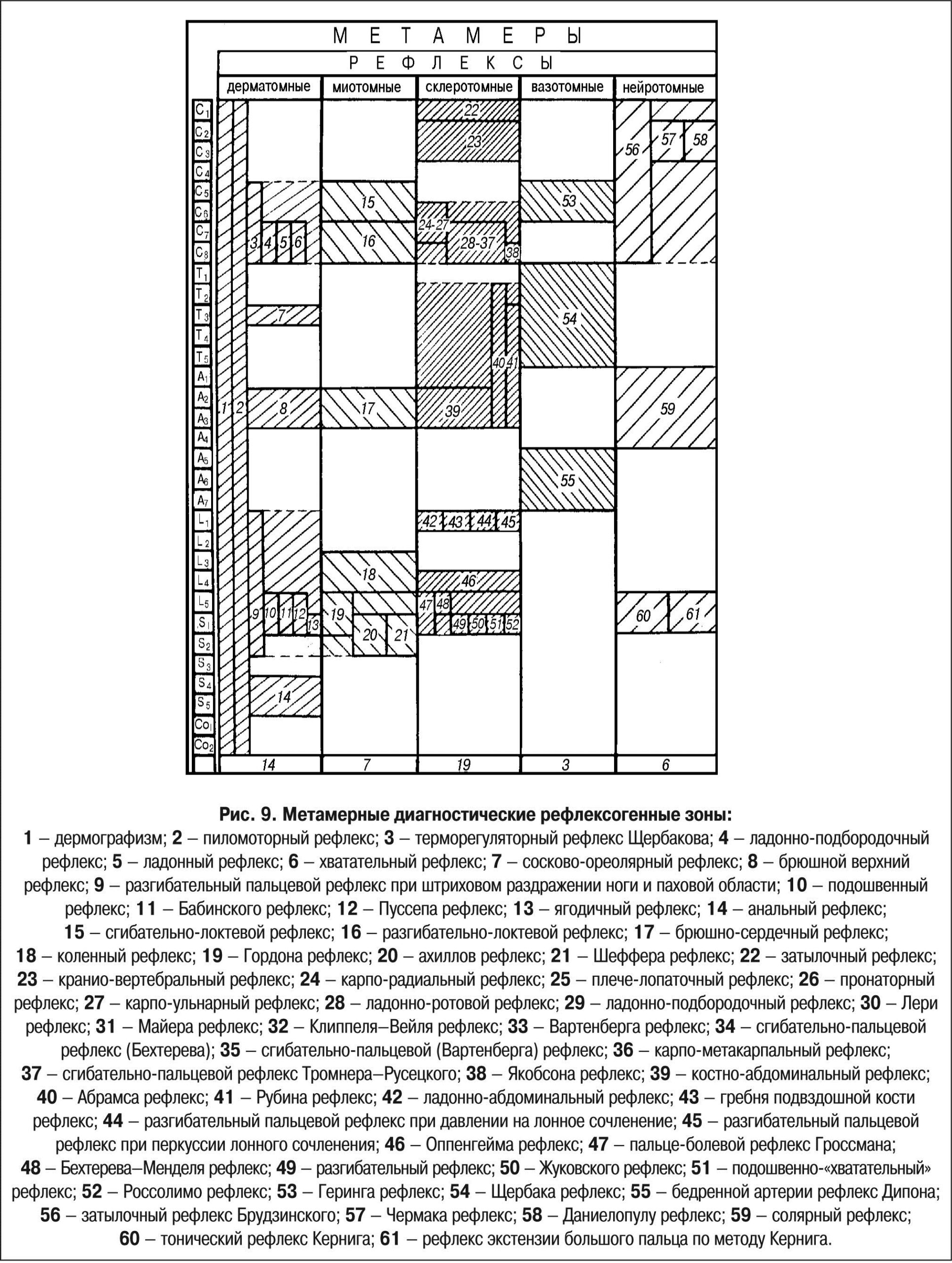 1 — дермографизм; 2 — пиломоторный рефлекс; 3 — терморегуляторный рефлекс Щербакова; 4 — ладонно-подбородочный рефлекс; 5 — ладонный рефлекс; 6 — хватательный рефлекс; 7 — сосково-ореолярный рефлекс; 8 — брюшной верхний рефлекс; 9 — разгибательный пальцевой рефлекс при штриховом раздражении ноги и паховой области; 10 — подошвенный рефлекс; 11 — Бабинского рефлекс; 12 — Пуссепа рефлекс; 13 — ягодичный рефлекс; 14 — анальный рефлекс; 15 — сгибательно-локтевой рефлекс; 16 — разгибательно-локтевой рефлекс; 17 — брюшно-сердечный рефлекс; 18 — коленный рефлекс; 19 — Гордона рефлекс; 20 — ахиллов рефлекс; 21 — Шеффера рефлекс; 22 — затылочный рефлекс; 23 — кранио-вертебральный рефлекс; 24 — карпо-радиальный рефлекс; 25 — плече-лопаточный рефлекс; 26 — пронаторный рефлекс; 27 — карпо-ульнарный рефлекс; 28 — ладонно-ротовой рефлекс; 29 — ладонно-подбородочный рефлекс; 30 — Лери рефлекс; 31 — Майера рефлекс; 32 — Клиппеля—Вейля рефлекс; 33 — Вартенберга рефлекс; 34 — сгибательно-пальцевой рефлекс (Бехтерева); 35 — сгибательно-пальцевой (Вартенберга) рефлекс; 36 — карпо-метакарпальный рефлекс; 37 — сгибательно-пальцевой рефлекс Тромнера—Русецкого; 38 — Якобсона рефлекс; 39 — костно-абдоминальный рефлекс; 40 — Абрамса рефлекс; 41 — Рубина рефлекс; 42 — ладонно-абдоминальный рефлекс; 43 — гребня подвздошной кости рефлекс; 44 — разгибательный пальцевой рефлекс при давлении на лонное сочленение; 45 — разгибательный пальцевой рефлекс при перкуссии лонного сочленения; 46 — Оппенгейма рефлекс; 47 — пальце-болевой рефлекс Гроссмана; 48 — Бехтерева—Менделя рефлекс; 49 — разгибательный рефлекс; 50 — Жуковского рефлекс; 51 — подошвенно-«хватательный» рефлекс; 52 — Россолимо рефлекс; 53 — Геринга рефлекс; 54 — Щербака рефлекс; 55 — бедренной артерии рефлекс Дипона; 56 — затылочный рефлекс Брудзинского; 57 — Чермака рефлекс; 58 — Даниелопулу рефлекс; 59 — солярный рефлекс; 60 — тонический рефлекс Кернига; 61 — рефлекс экстензии большого пальца по методу Кернига.