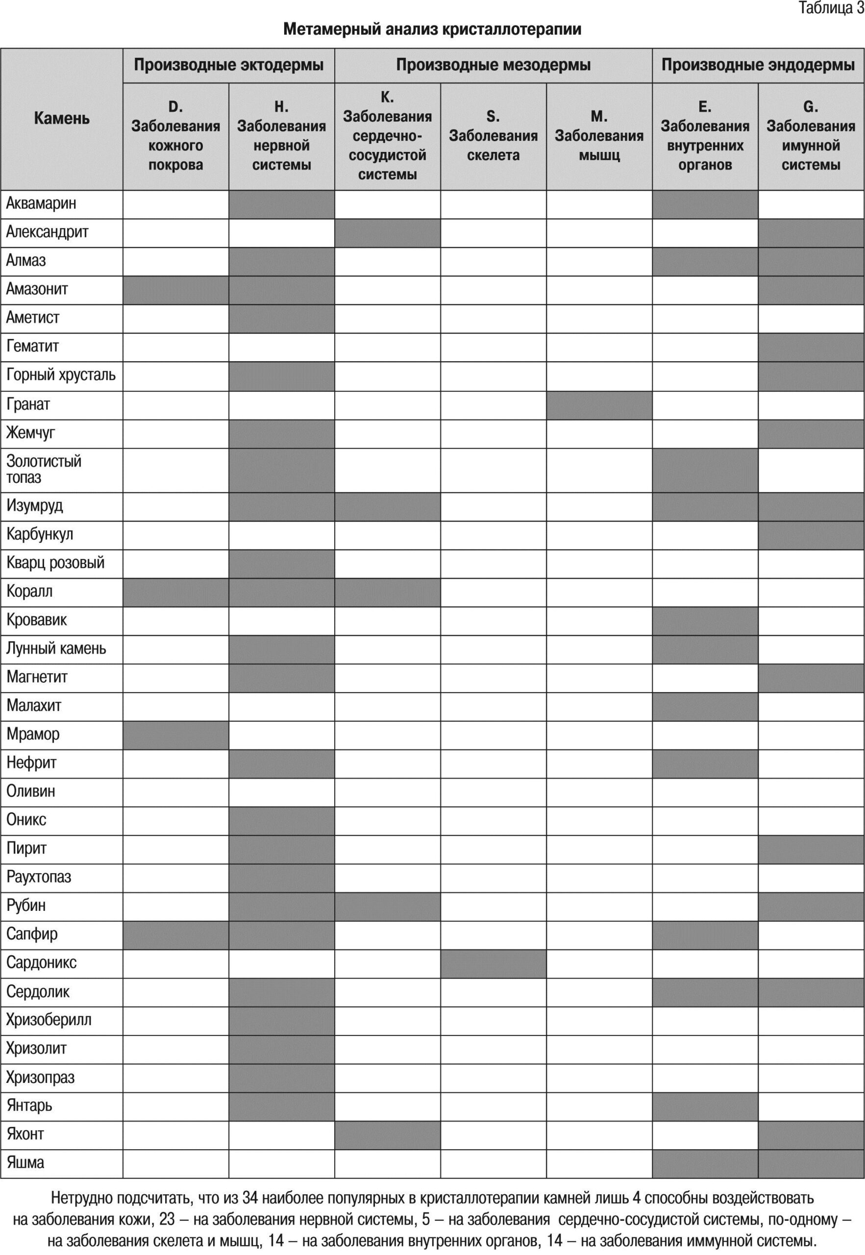 Проследить закономерности метамерных лечебных технологий лучше и легче всего на модели кристаллотерапии (табл. 3). Согласен, это упрощение проблемы, сведённое чуть ли не до примитивизма. Всё чаще в книгах для пациентов приходится идти по научно-популярному пути. Поскольку, в отличие от специальной литературы, эти книги пользуются спросом и дают возможность охватить широкий круг читателей. Это тоже крайне необходимо, поскольку успех лечения примерно в равных долях зачастую зависит как от квалификации врача, так и от желания пациента выздороветь. Его-то, пациента, мы и пытаемся при помощи таких публикаций обратить в союзники врача.