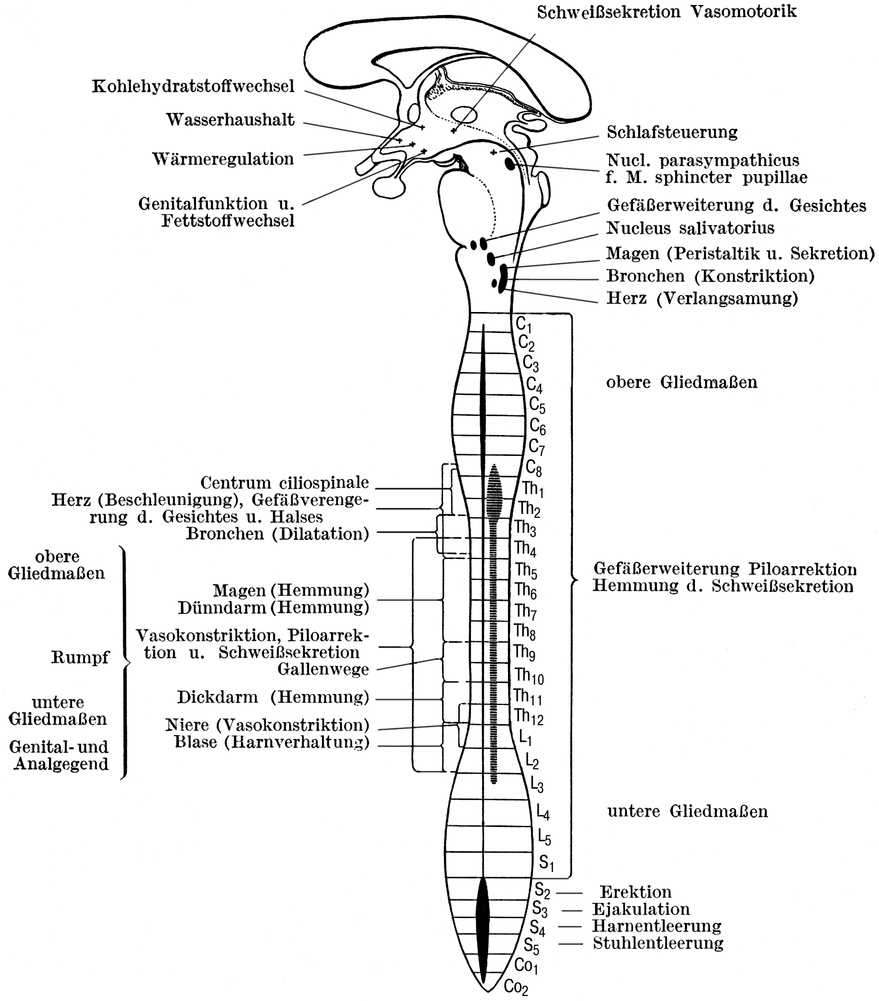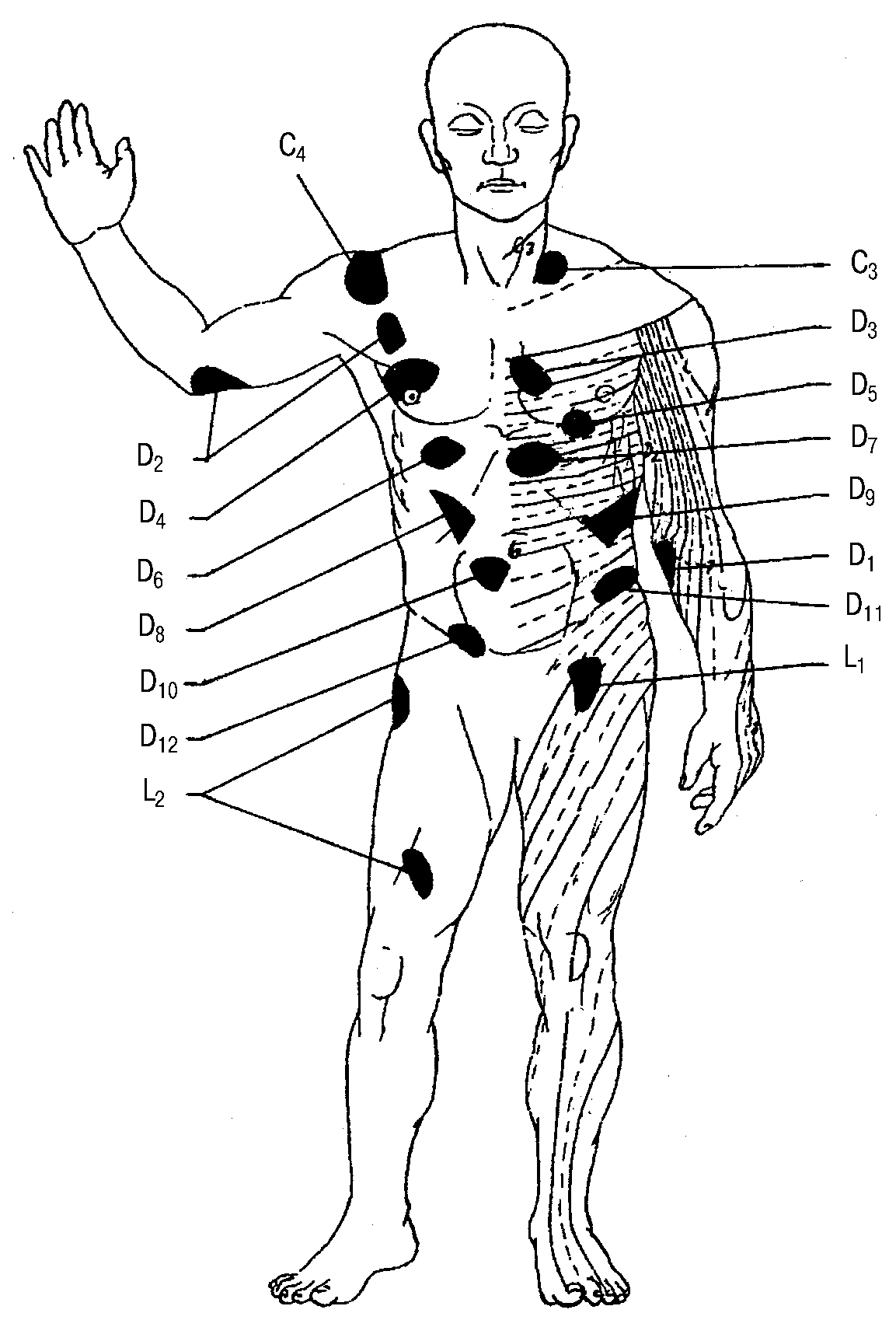 C3—C4, D1—D3 (D4?) — восходящая аорта; D2—D5 (D6?) — желудок; D9—D12 — кишки; S2—S4 — прямая кишка; С3—С4, D7—D10 (D6?) — печень; D8—D9 (D7?) — жёлчный пузырь; D10—L1 (L2?) — почка, мочеточник; D11—L2, S3—S4 — мочевой пузырь; D10—D12, S1—S3 (L5?) — предстательная железа; D11—D12 (L2?) — придаток яичника; D10 — яичко (яичник); D11—L1 (L2) — придаток матки; D4—D5 — молочные железы; D10—L1 (L2?) — матка.