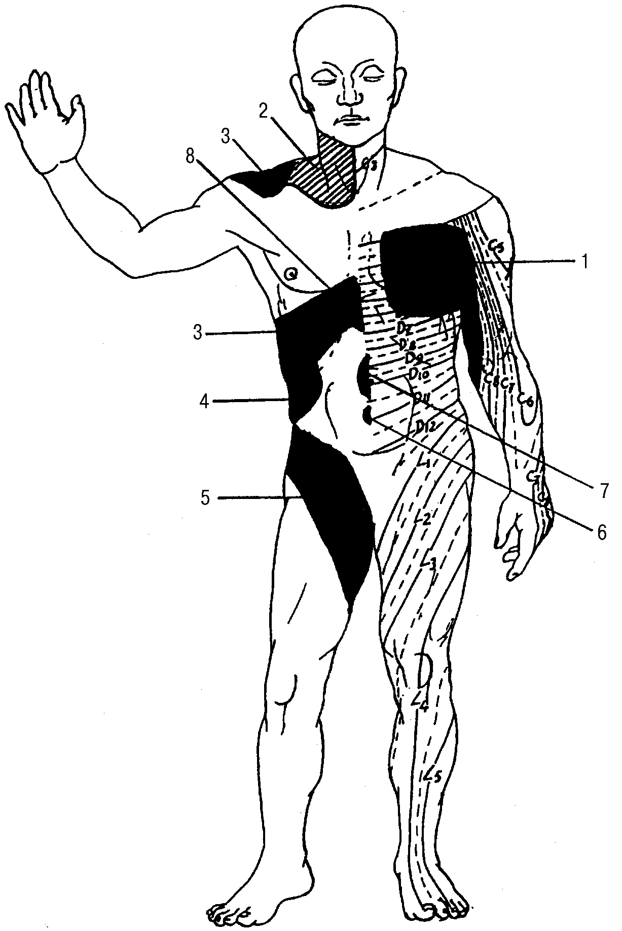 Изображены проекции: 1 — сердца; 2 — лёгких; 3 — печени; 4 — почек; 5 — мочеточника; 6 — мочеполовых органов; 7 — тонкой кишки; 8 — поджелудочной железы.